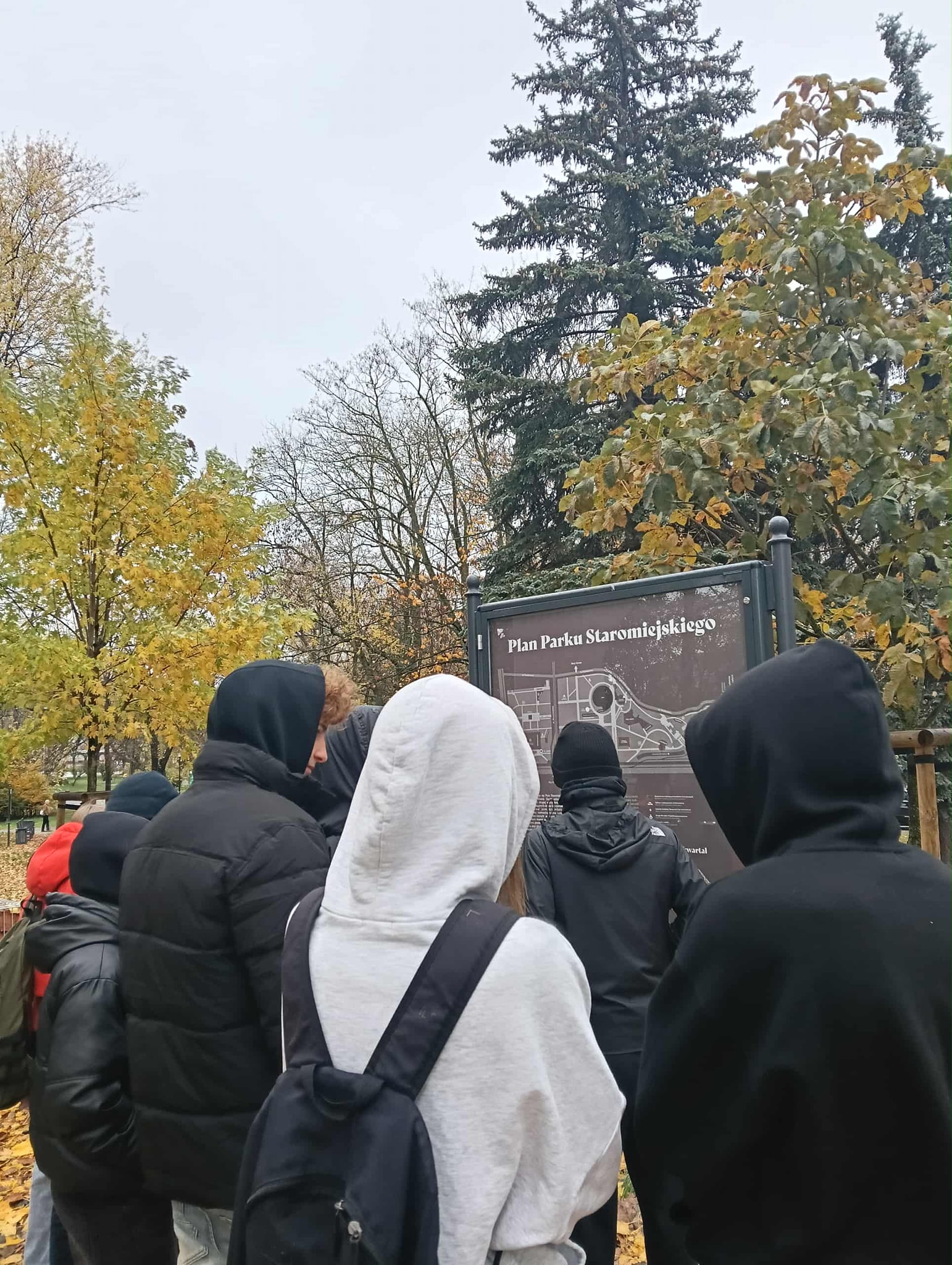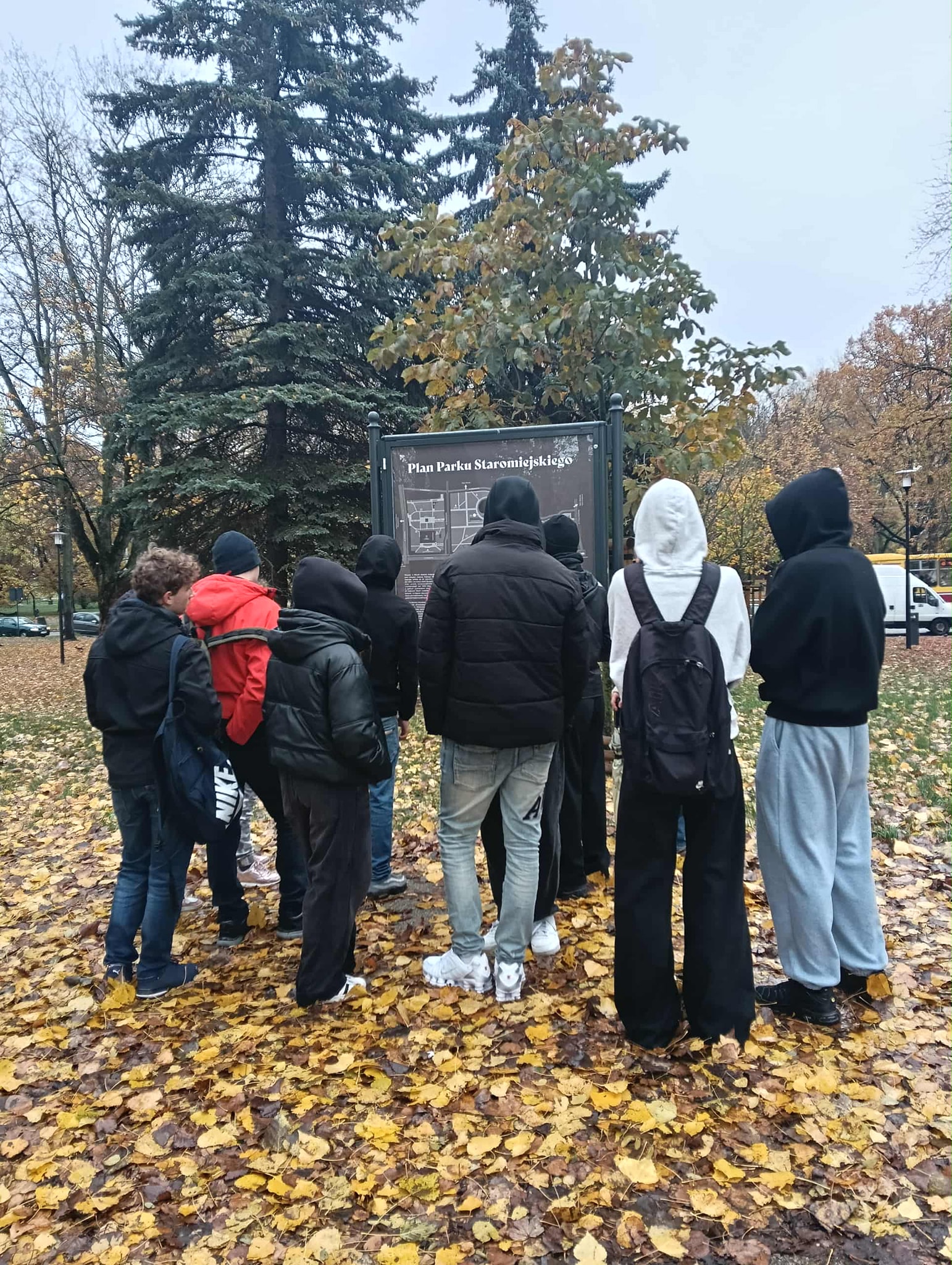 Młodzież po spacerze ulicą Piotrkowską, zatrzymała się na chwilę w Parku Staromiejskim, by poznać jego historię.