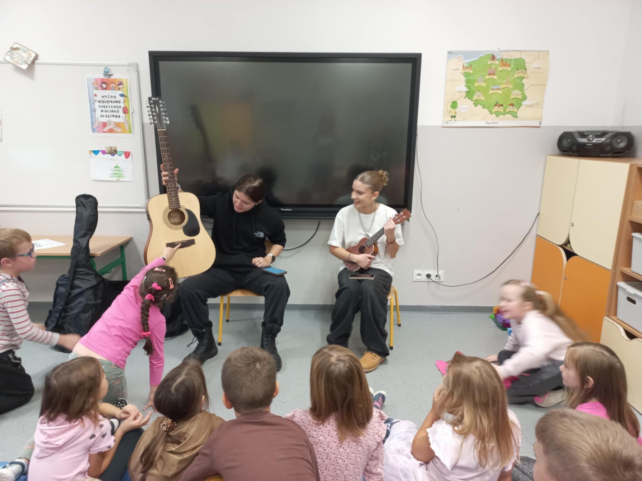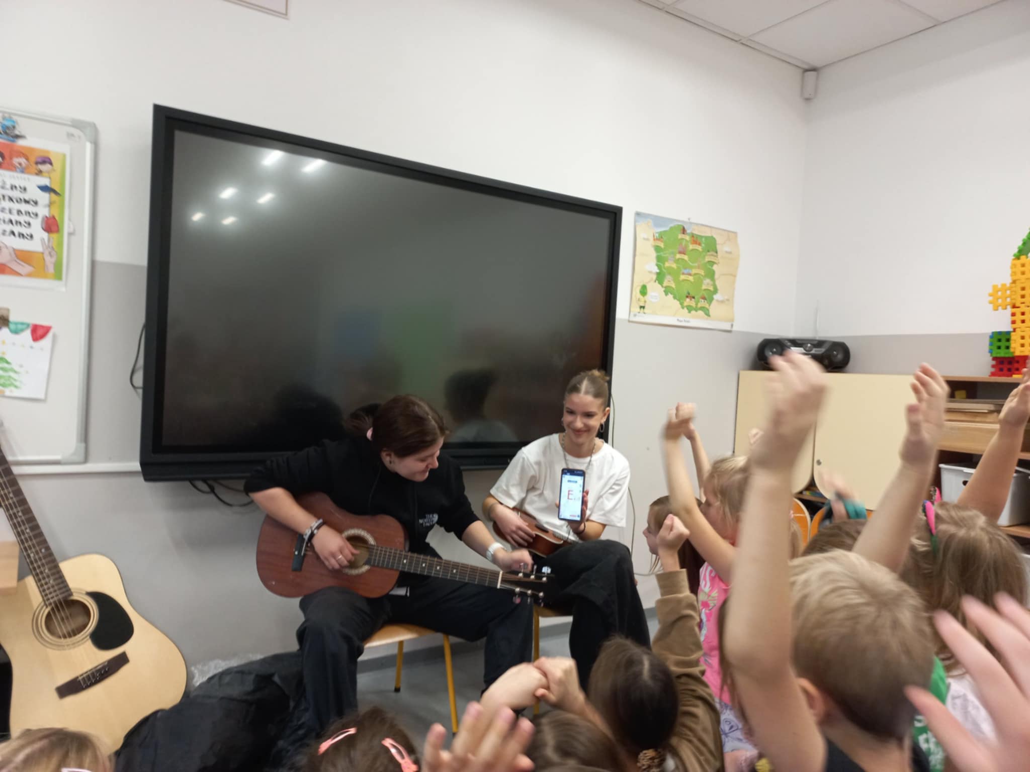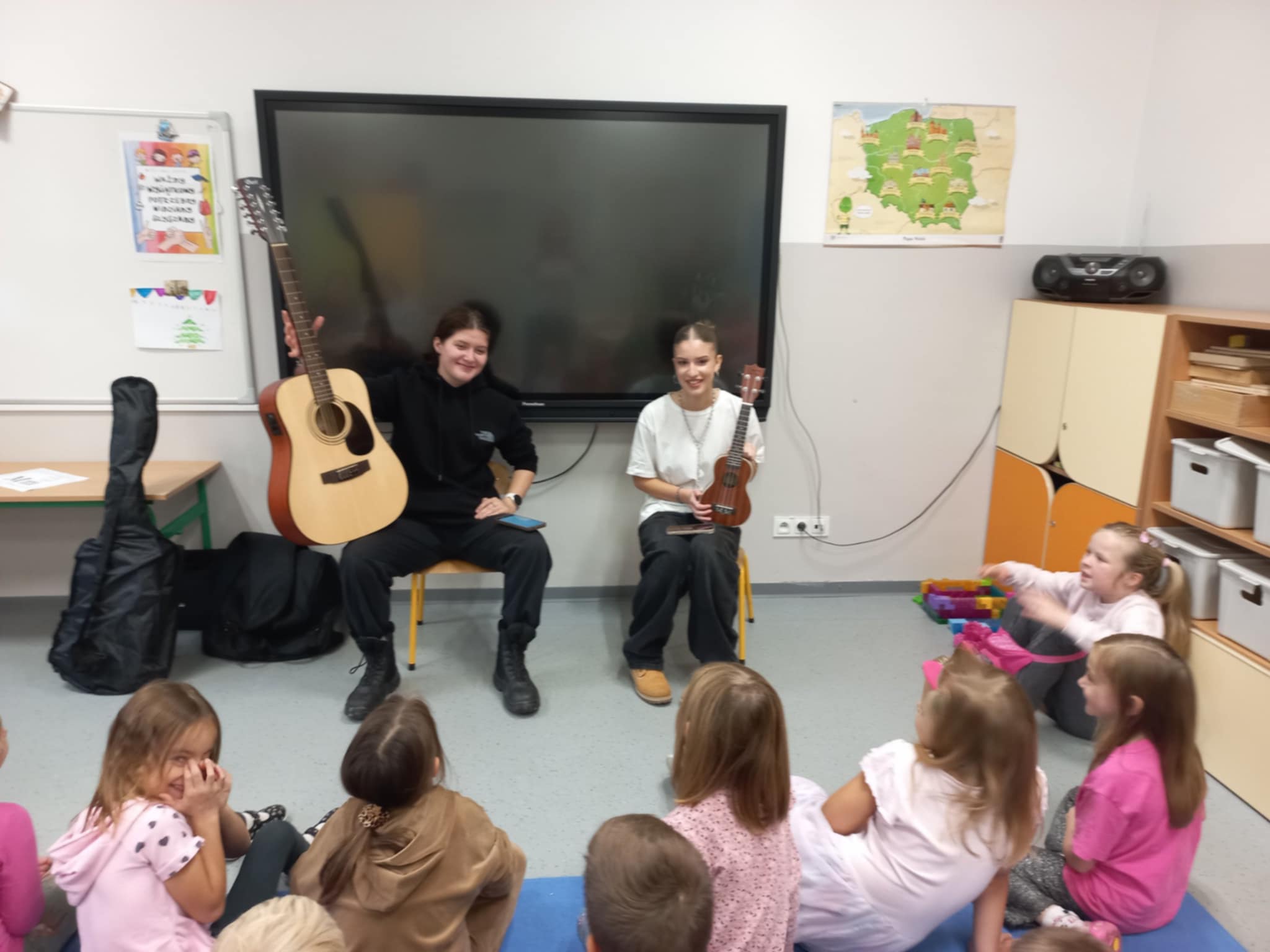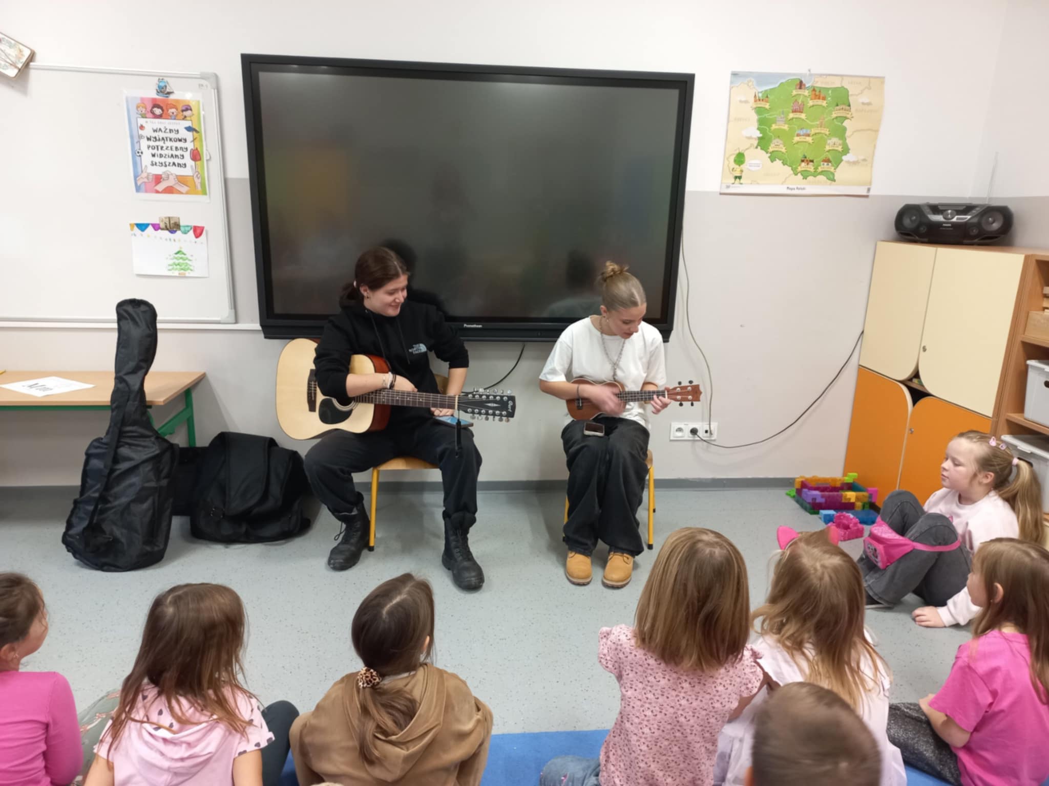 Następnie uczennice z kl. III C przygotowały krótki koncert, podczas którego zagrały dziecięce melodie oraz inne znane piosenki. Pokazały też jak stroi się gitarę. Muzyka wprowadziła dzieci w nastrój radosnej zabawy, a na ich twarzach malowały się uśmiechy.