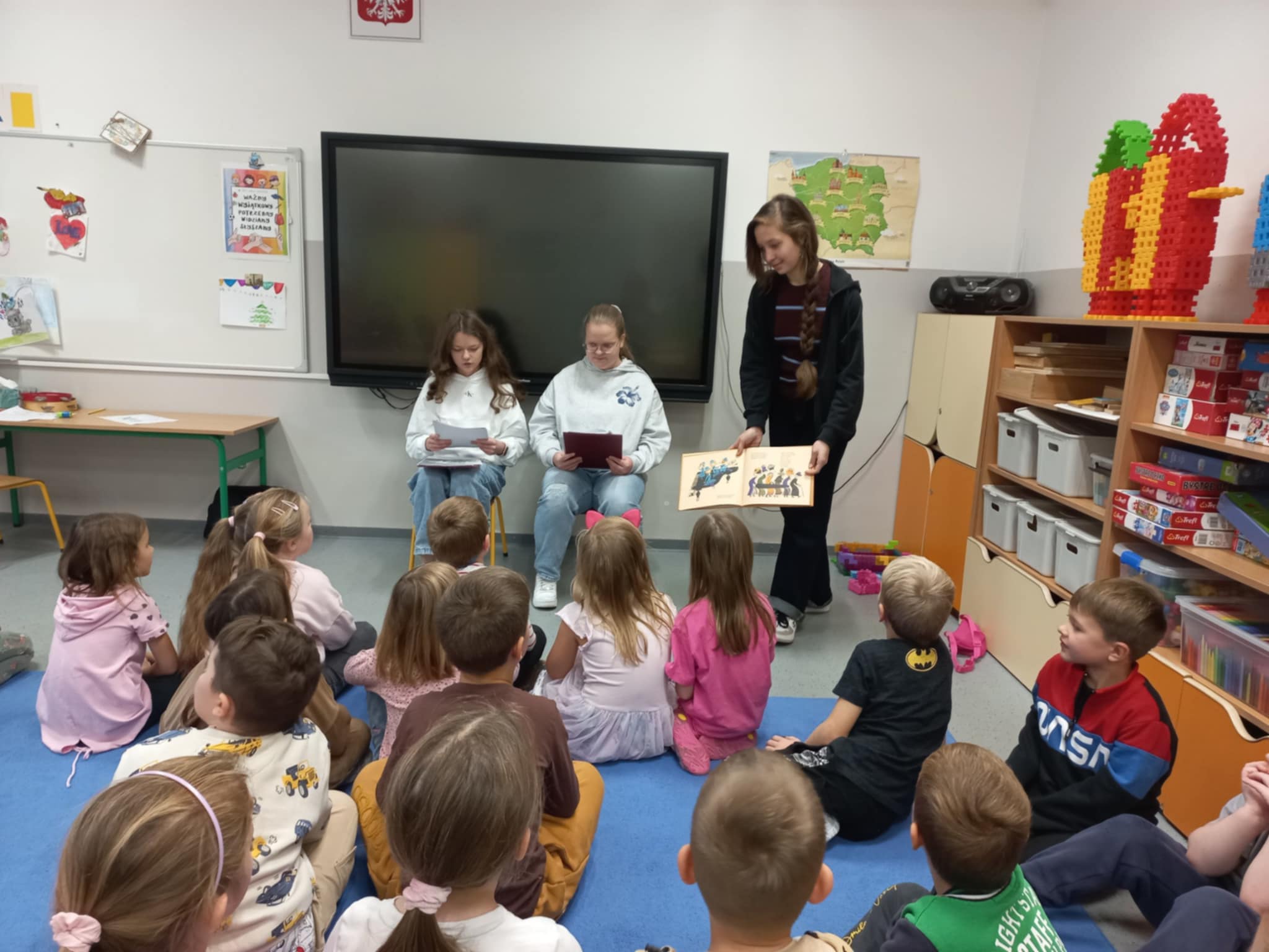 W poniedziałek 15 października 2025r. w ramach innowacji pedagogicznej „Licealiści czytają przedszkolakom” uczennice naszego liceum oraz nauczyciel bibliotekarz odwiedziły dzieci z oddziału przedszkolnego przy Szkole Podstawowej im. Henryka Sienkiewicza w Wiśniowej Górze.