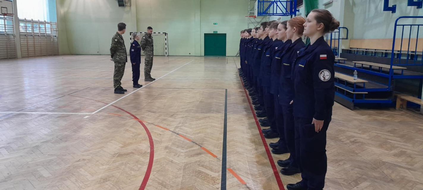 W ramach zajęć praktycznych pod czujnym okiem kaprala SG Wiktora Stefańskiego oraz plutonowego SG Dominika Wyderkiewicza doskonalili elementy musztry: postawę zasadniczą i swobodną oraz wykonywanie zwrotów.