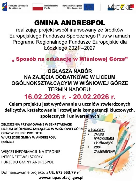 Gmina Andrespol, realizując projekt współfinansowany ze środków Europejskiego Funduszu Społecznego Plus w ramach Programu Regionalnego Fundusze Europejskie dla Łódzkiego 2021 –2027 pn. Sposób na edukację w Wiśniowej Górze, ogłasza nabór na zajęcia dodatkowe w Liceum Ogólnokształcącym w Wiśniowej Górze.