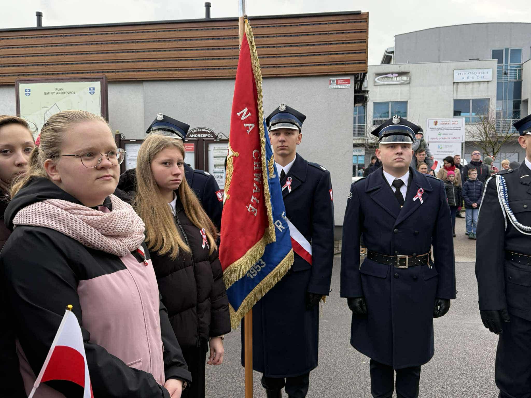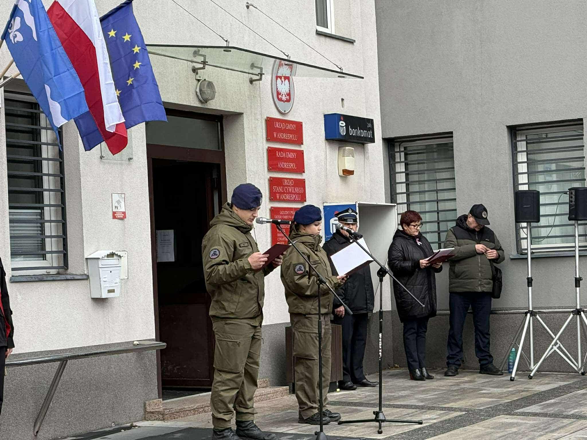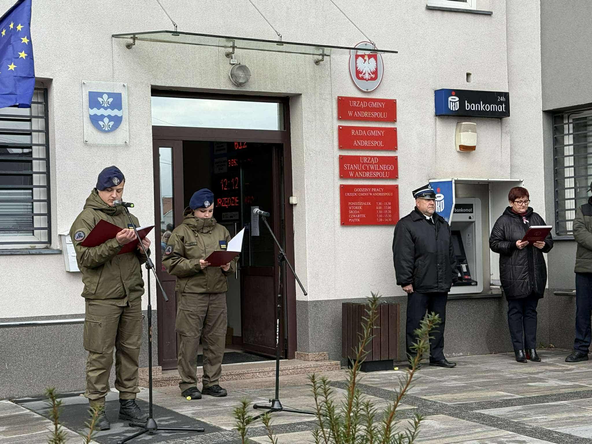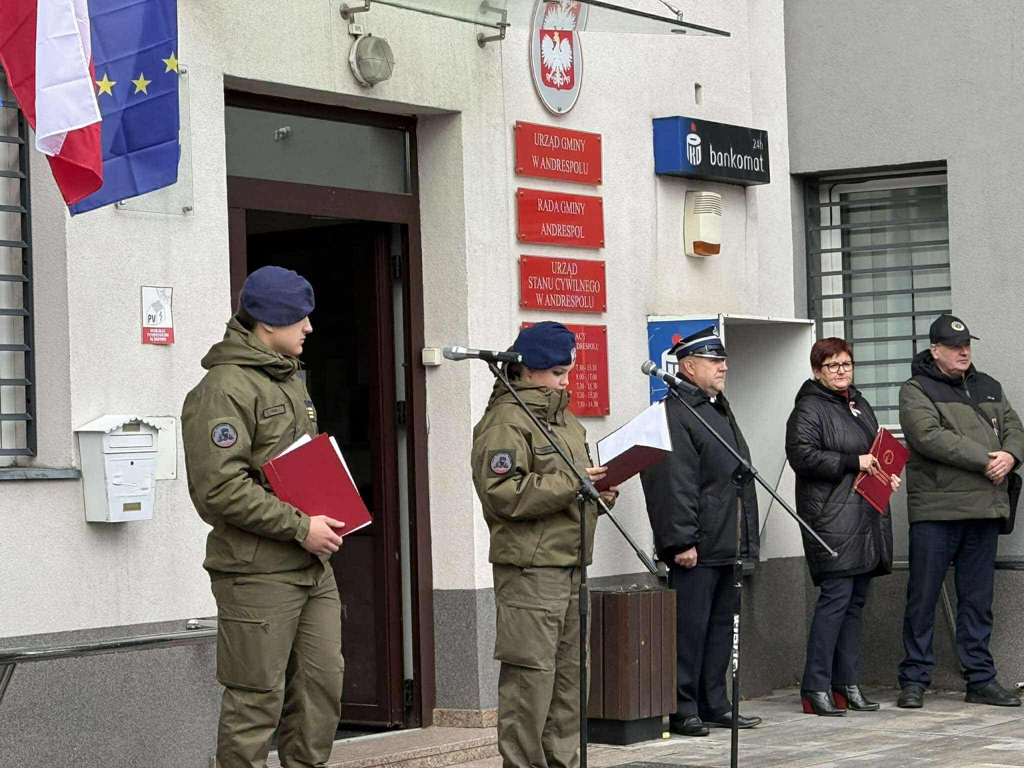 Podczas uroczystości pod Urzędem Gminy Andrespol młodzież zaprezentowała program artystyczny poświęcony współczesnym odsłonom patriotyzmu – pokazując, że miłość do ojczyzny można wyrażać nie tylko przez pamięć o historii, ale także przez codzienne działania, solidarność i odpowiedzialność.